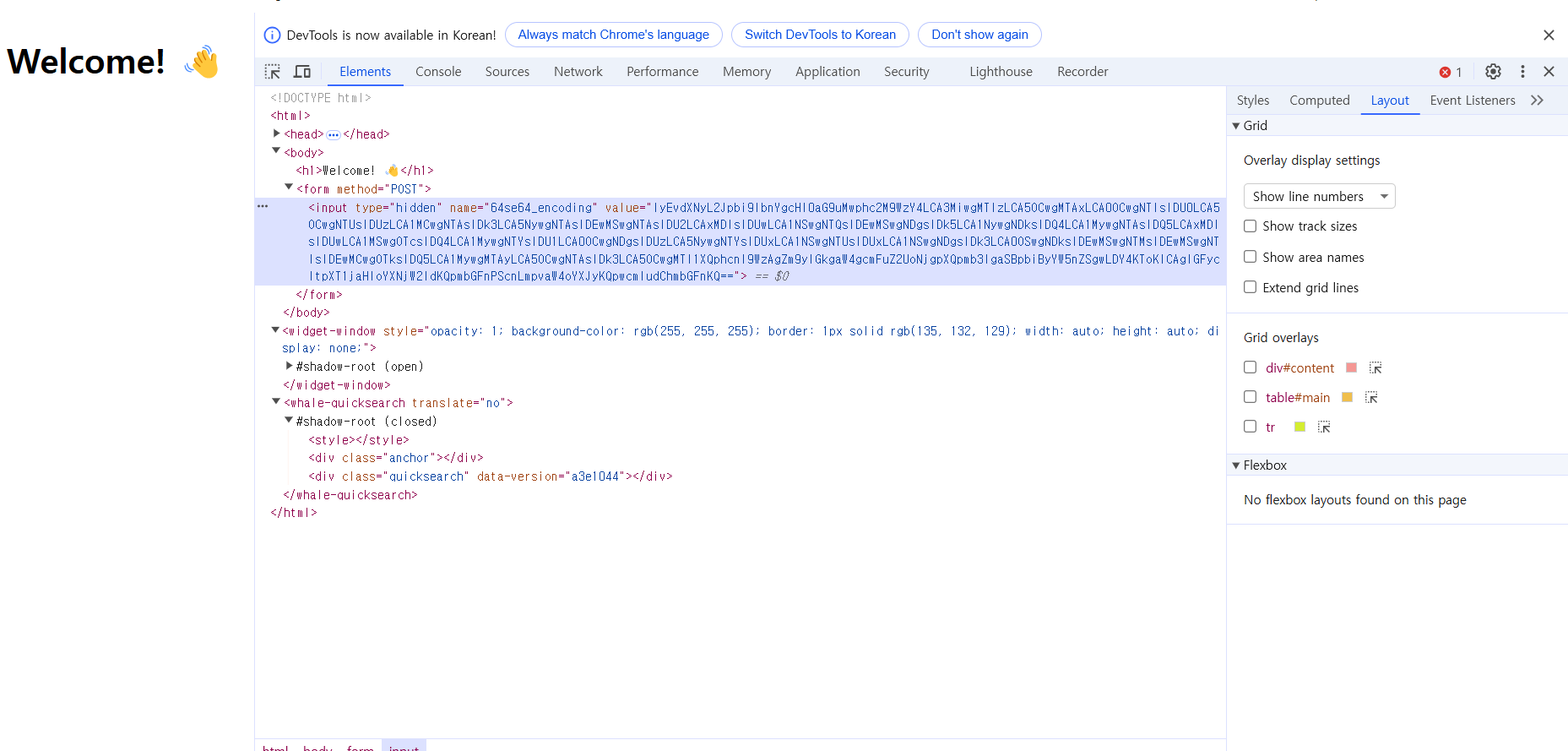 서버를 생성하고 관리자모드(F12)를 눌러서 코드를 확인하니 hidden 코드가 보였다.