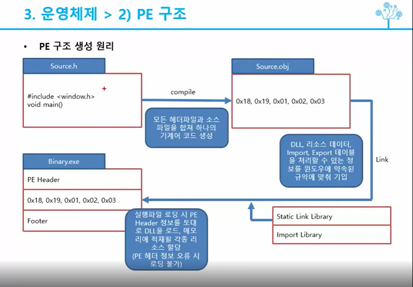 PE 구조 : 이동 가능하면서도 실행할 수 있는 프로그램을 만들기 위해 제작// exe 파일은 dll 이라는 라이브러리를 필요로 함. 이 라이브러리를 제공해주는 거이 윈도우 서브 시스템. 이 서브 시스템이 유저 어플리케이션에서 exe파일을 동작하기 위해 데이터를 제공하고 하드웨어 사용을 도와줌