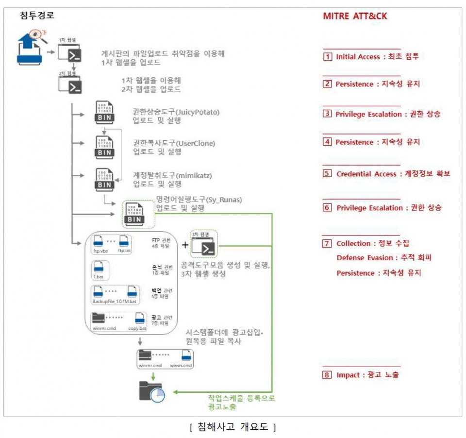 - 공격 개요 : 공격자는 웹서버에 방치된 게시판의 파일업로드 취약점을 악용해 웹셸을 업로드했고, 권한상승도구로 시스템 권한을 획득했다. 공격자는 획득한 시스템 권한으로 게스트 계정에 관리자권한을 부여했고, 계정탈취도구로 관리자 계정정보를 얻었다.이후 공격자는 관리자 계정정보를 활용해 명령어실행도구를 통해 광고 코드가 삽입된 비정상 페이지를 게시하는 스케줄을 등록했다. 관리자가 피해서버 접속에서 벗어나면, 공격자는 홈페이지 방문자에게 광고를 노출해 수익을 얻어 가는 형식이다.