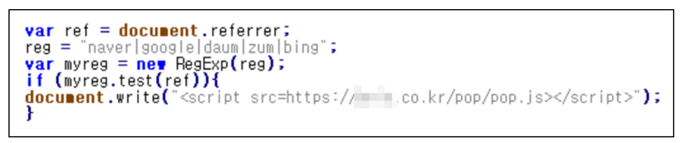 해당 악성 스크립트는 검색 엔진을 통해 검색하여 접속한 경우에만 동작 / 사용자가 직접 도메인 주소를 입력하여 접속한 경우에는 동작하지 않는다.