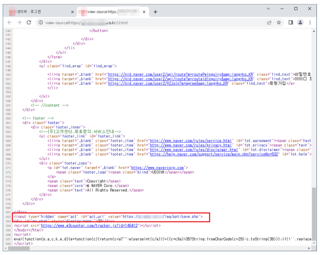 정상 사이트에 악성 스크립트를 삽입하여 네이버 계정정보를 탈취하는 공격