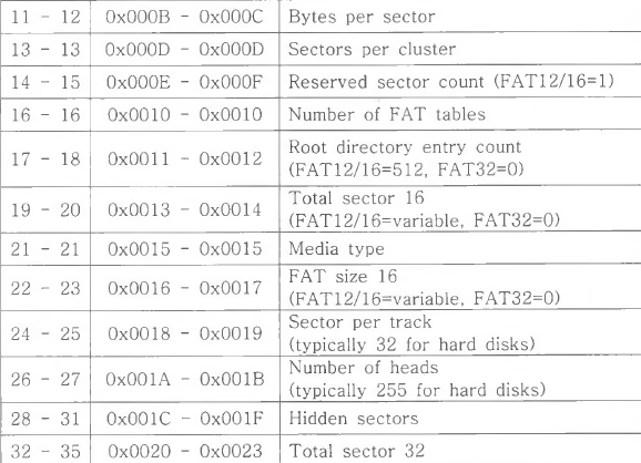 FAT 파일 시스템을 분석할 경우 반드시 부트 섹터의 오프셋 14-15(Reserved Sector Count)값을 확인해야 한다. 예약 영역의 크기는 가변적이지만 0, 1, 2, 6, 7, 8 번 섹터는 미리 정해져 있다.