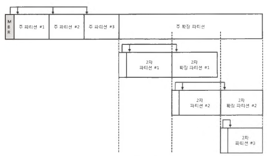 MBR 영역에서 파티션 정보를 표현하는 공간은 64바이트로 총 4개까지만 파티션을 분할할 수 있다. 이런 한계를 극복하기 위해 나온 개념이 확장 파티션이다. 확장 파티션의 구조는 MBR의 구조를 그대로 사용한다. 구체적으로 말하면 MBR영역이 담고 있는 4개의 파티션 테이블 정보에서 마지막 4번째 파티션 테이블이 가리키는 위치가 또 다른 MBR 영역을 가리켜 추가적으로 4개의 파티션을 담을 수 있도록 하는 구조이다.