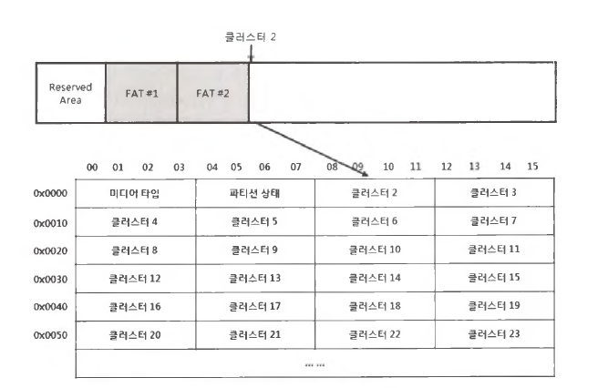 FAT 영역은 데이터 영역의 클러스터 할당 상태를 표시한다. FAT16은 16비트, FAT32는 32비트를 사용해 데이터 영역의 시작 클러스터부터 마지막 클러스터까지의 할당 상태를 표시한다.