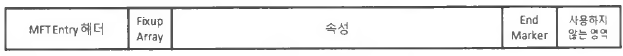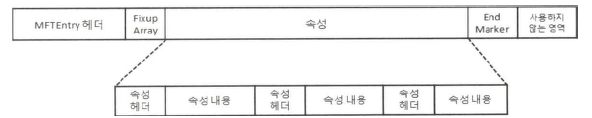 모든 MFT Entry는 1024 바이트의 고정된 크기이다. 먼저 42 바이트 크기의 고정된 헤더가 나오고 이후에 Fixup 배열과 속성들이 온다. MFT Entry는 Entry의 마지막을 표시하기 위해 End Marker(0xFFFFFFFF)을 사용한다. 속성들의 정보가 많아져 하나 이상의 MFT Entry를 사용할 경우 마지막 MFT Entry의 끝에 End Marker가 표시된다.