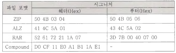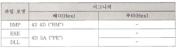 파일 카빙은 파일의 메타정보를 이용하지 않기 때문에 파일의 고유한 특성을 이용해 복구해야 한다. 시그니처 기반 카빙 기법은 파일 포맷별로 존재하는 고유 한 시그니처를 이용하는 방법이다. 시그니처는 파일의 시작 부분에 위치하는 헤 더(Header) 시그니처와 파일의 마지막에 존재하는 푸터(Footer) 시그니처가 있 다. 따라서 헤더와 푸터 시그니처가 모두 존재하는 파일의 경우 두 시그니처 사 이의 데이터가 파일 내용이 될 것이다.