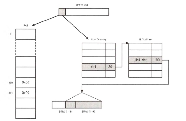 FAT 파일 시스템 : FAT 영역에서 0x00 값을 갖는 Directory Entry를 검색하여 각 Entry 대응되는 클러스터를 찾는다.