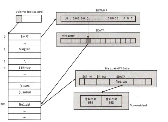 VBR(Volume Boot Record)영역이 가장 앞에 위치하고 있어서 MFT 영역과 데이터 영역이 있다. VBR영역은 부트 섹터와 추가적인 부트 코드가 저장되는 부분이다. MFT 영역은 파일과 디렉터리를 관리하기 위한 MFT Entry의 집합체이다. FAT 파일시스템에서는 FAT 영역의 크기가 데이터 영역의 클러스터 수에 따라 정해지기 때문에 파일 시스템을 생성할 때에 고정된 FAT 공간을 할당할 수 있다. 하지만 MFT 영역에 들어가는 MFT Entry는 생성될 파일의 수를 미리 예측하기 어렵기 때문에 NTFS 영역에 들어가는 MFT 영역은 고정된 크기를 가질 수 없다. MFT 영역은 그 자체를 하나의 파일로 고려하기 때문에 데이터 영역과 구별되지 않고 데이터 영역과 혼재되어 있다.