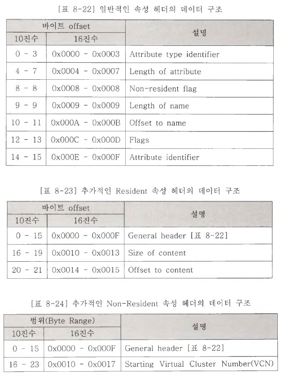 위의 표를 살펴보면 각 속성 앞부분에는 공통적으로 속성 헤더(Attribute Header)가 오는 것을 알 수 있다. 속성 헤더 항목은 해당 속성이 Resident 속성인지 Non-resident 속성인지에 따라 데이터 구조가 조금 다르다.