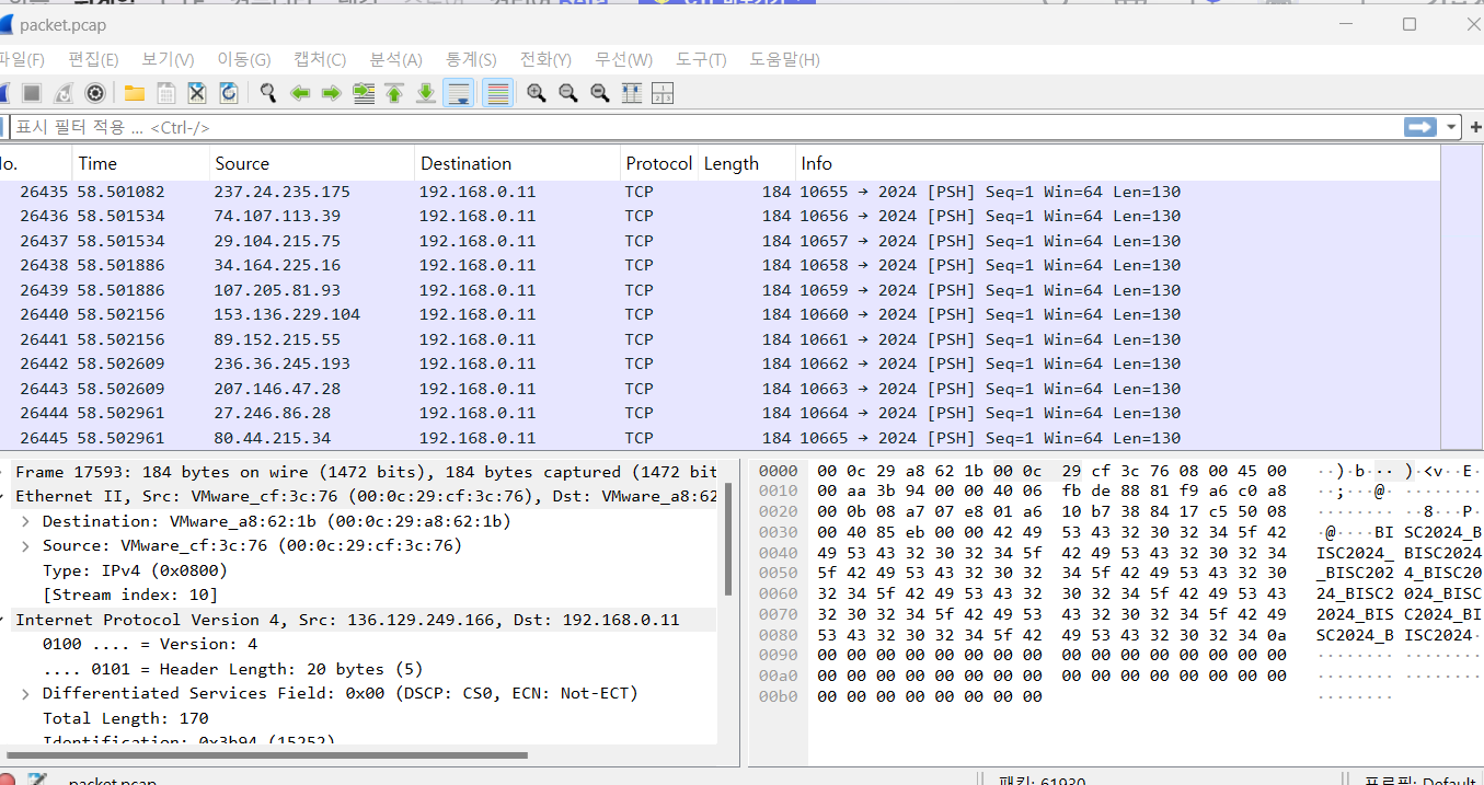 destination 과 length가 같은 구간을 발견했다. 그 부분을 조사하니 source : VMware_cf : 3c:76....은 동일하지만 출발지 ip는 다르다는 것을 확인하였다.