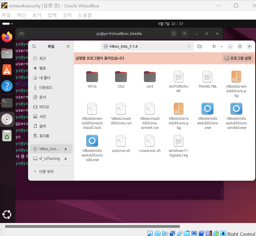 왼쪽 아래에 sf_ctfsoving이라는 폴더처럼 pc에서 만든 공유폴더를 확인할 수 있다.