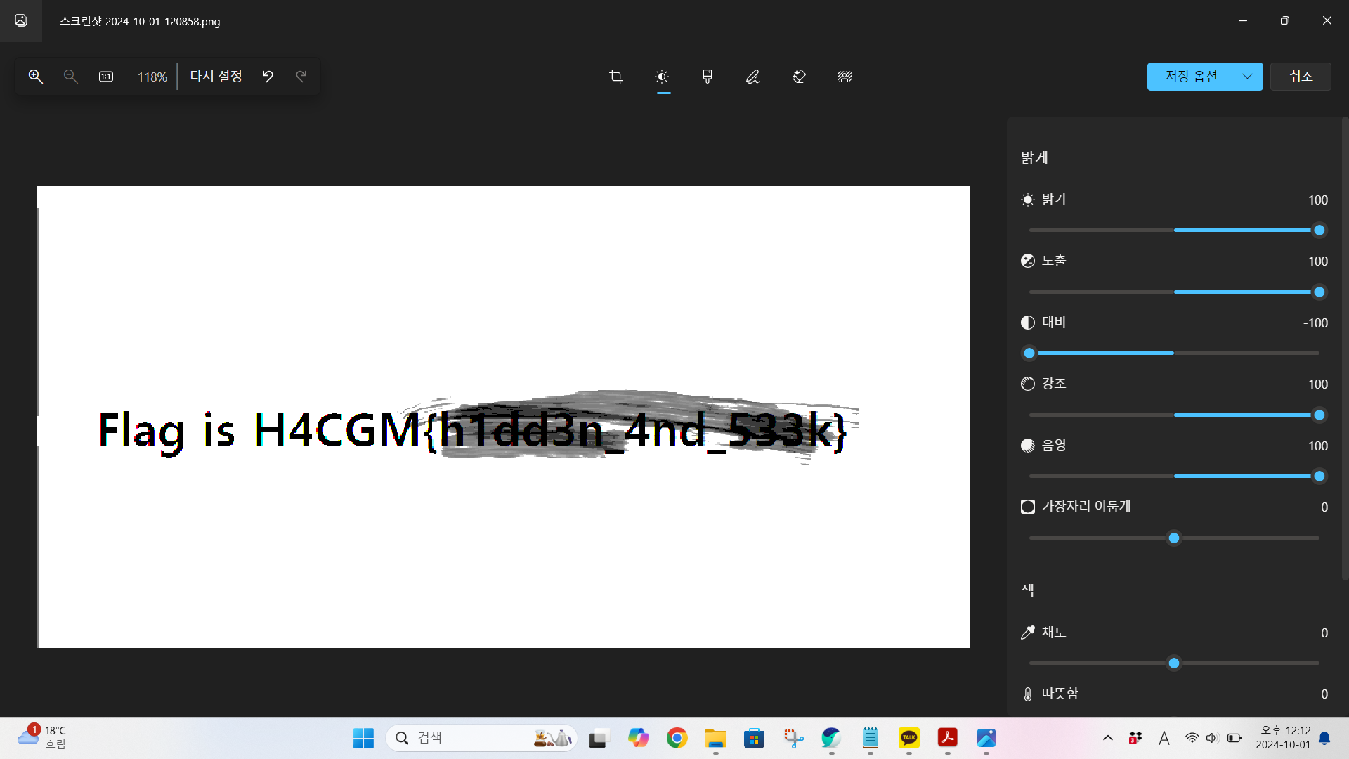 사진을 다운로드 받아보니 flag부분이 칠해져 있어 확인하지 못하는 상태였다. 윈도우의 사진 프로그램을 이용하여 밝기와 노출을 조절하여 flag부분을 확인할 수 있도록 하였다.